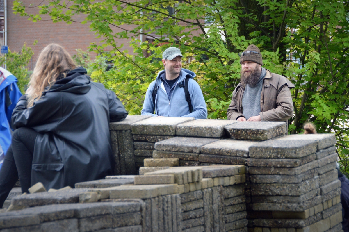 Stefan Darlan Boris in 2013 tijdens zijn bezoek aan de Le Roy-tuin in Heerenveen. (foto: Peter Wouda)Het is gestapeld door docent Stefan Darlan Boris, die al in 2013 samen met studenten van de School of Architecture een meerdaags werkbezoek bracht aan de ecokathedralen in Heerenveen en Mildam. Dit bezoek heeft hem gevormd in zijn denken over architectuur. De aanleiding om dit bouwwerk te maken is de Works & Words Biennale 2026 die van 5 maart tot 10 april 02026 wordt gehoude bij de School of Architecture in Aarhus wordt gehouden. Bij de opening op 5 maart gaf Boris een lezing over het hergebruik van stenen.